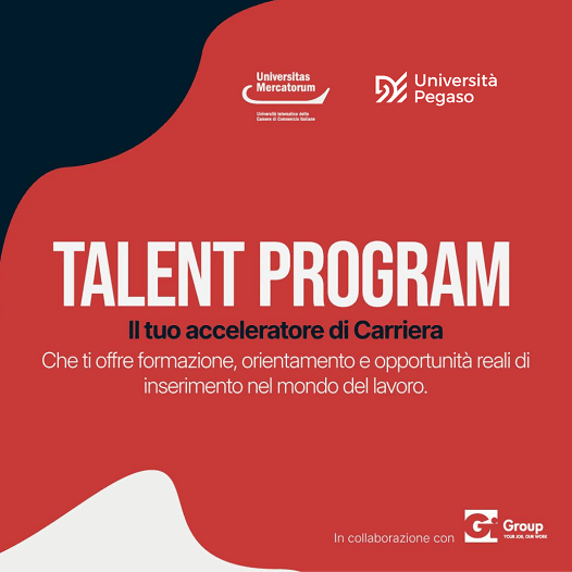Il Talent Program – Career Accelerator, realizzato da Università Pegaso e Università Mercatorum in collaborazione con Gi Group, è un percorso esclusivo, primo del suo genere in Italia, pensato per accompagnare i giovani talenti verso il mondo del lavoro. Attraverso formazione mirata, orientamento professionale e opportunità concrete di inserimento, il programma ti offre gli strumenti giusti per valorizzare il tuo potenziale e inserirti con un tirocinio post-laurea con rimborso nel mercato del lavoro.
